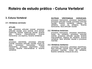 O documento descreve as principais características anatômicas da coluna vertebral e das costelas de diferentes animais. Detalha as vértebras cervicais, torácicas, lombares, sacrais e coccígeas, assim como as estruturas das costelas e do esterno. Fornece imagens ilustrativas dessas estruturas em bovinos, equinos e cães.