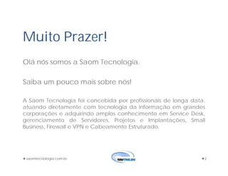 Este documento apresenta a empresa Saom Tecnologia, que oferece serviços de tecnologia da informação. A empresa foi fundada por profissionais experientes de TI e oferece serviços como help desk, gerenciamento de servidores, projetos e implantações, soluções para pequenas e médias empresas, firewall e VPN. A Saom Tecnologia busca fornecer soluções de ponta para promover o avanço tecnológico de seus clientes de forma transparente e comprometida.