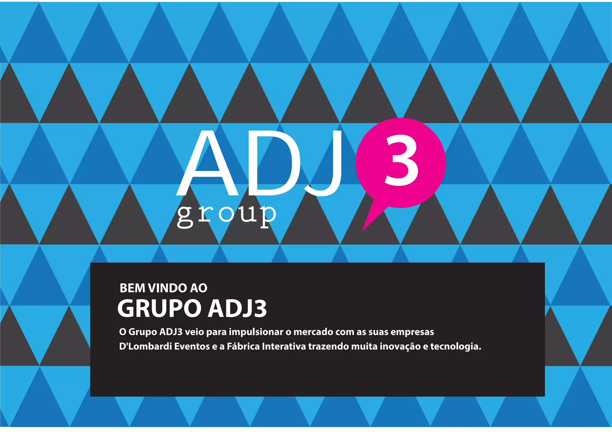 O documento apresenta o Grupo ADJ3, composto pelas empresas D'Lombardi Eventos e Fábrica Interativa, que oferecem serviços de marketing digital, como desenvolvimento de sites, mídia online e análise de presença em redes sociais.