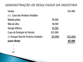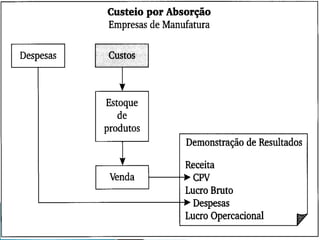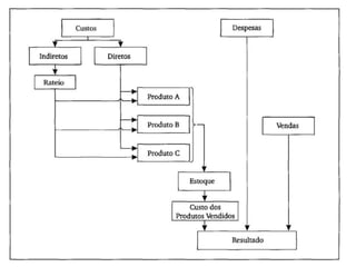 O documento apresenta uma introdução sobre contabilidade de custos, abordando tópicos como fatores de produção, métodos de custos e terminologia relacionada a custos, como custos diretos, indiretos, fixos e variáveis. Também discute classificação e nomenclatura de custos e conceitos de estoques em empresas industriais.