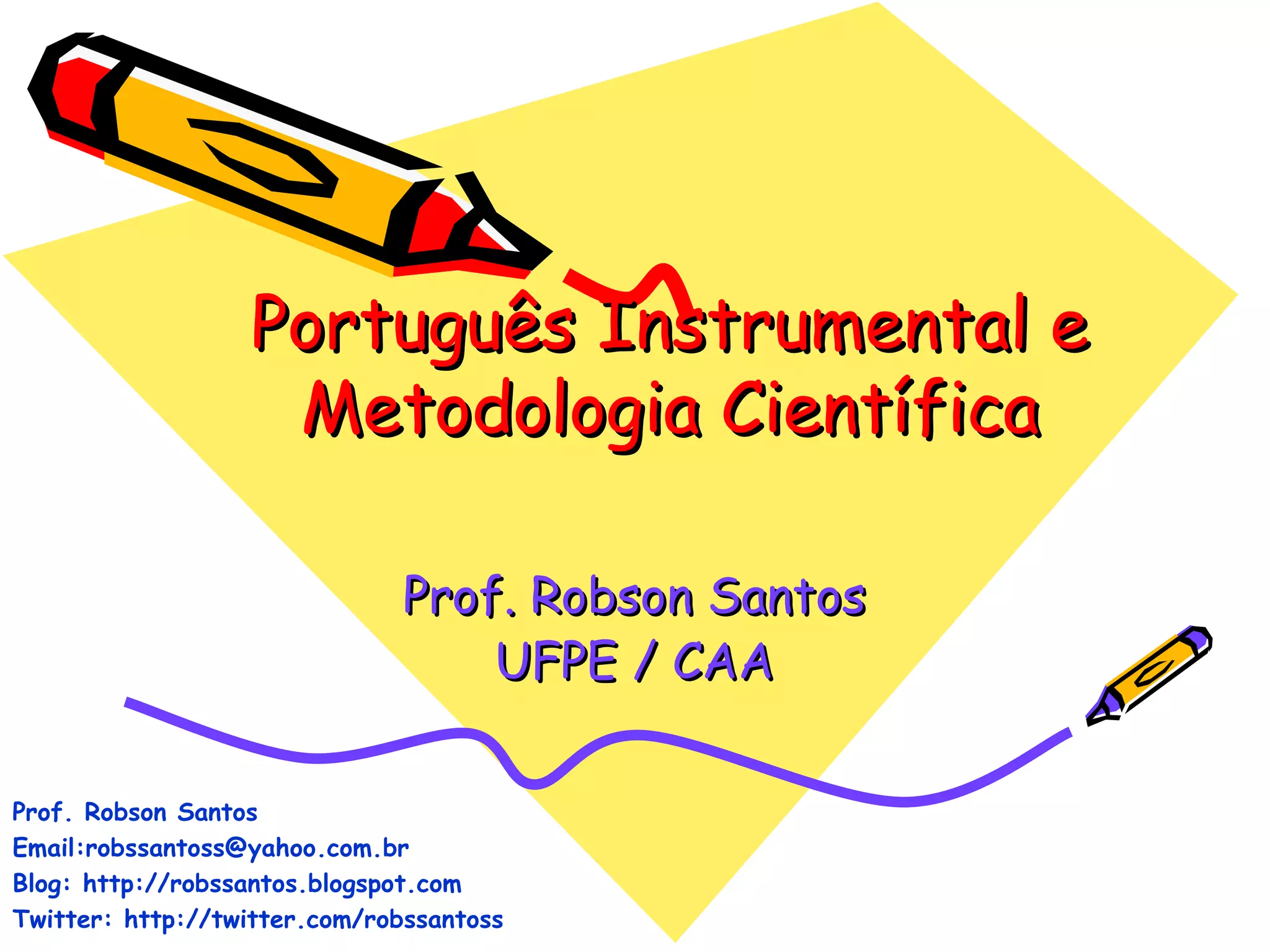 Este documento apresenta o plano de curso de Português Instrumental e Metodologia Científica ministrado pelo professor Robson Santos. O curso abordará técnicas de estudo como leitura, resumo e fichamento, além de produção de textos acadêmicos como relatórios, monografias e artigos. O cronograma inclui discussões sobre ciência, método científico e apresentação do conteúdo programático ao longo de agosto a novembro.