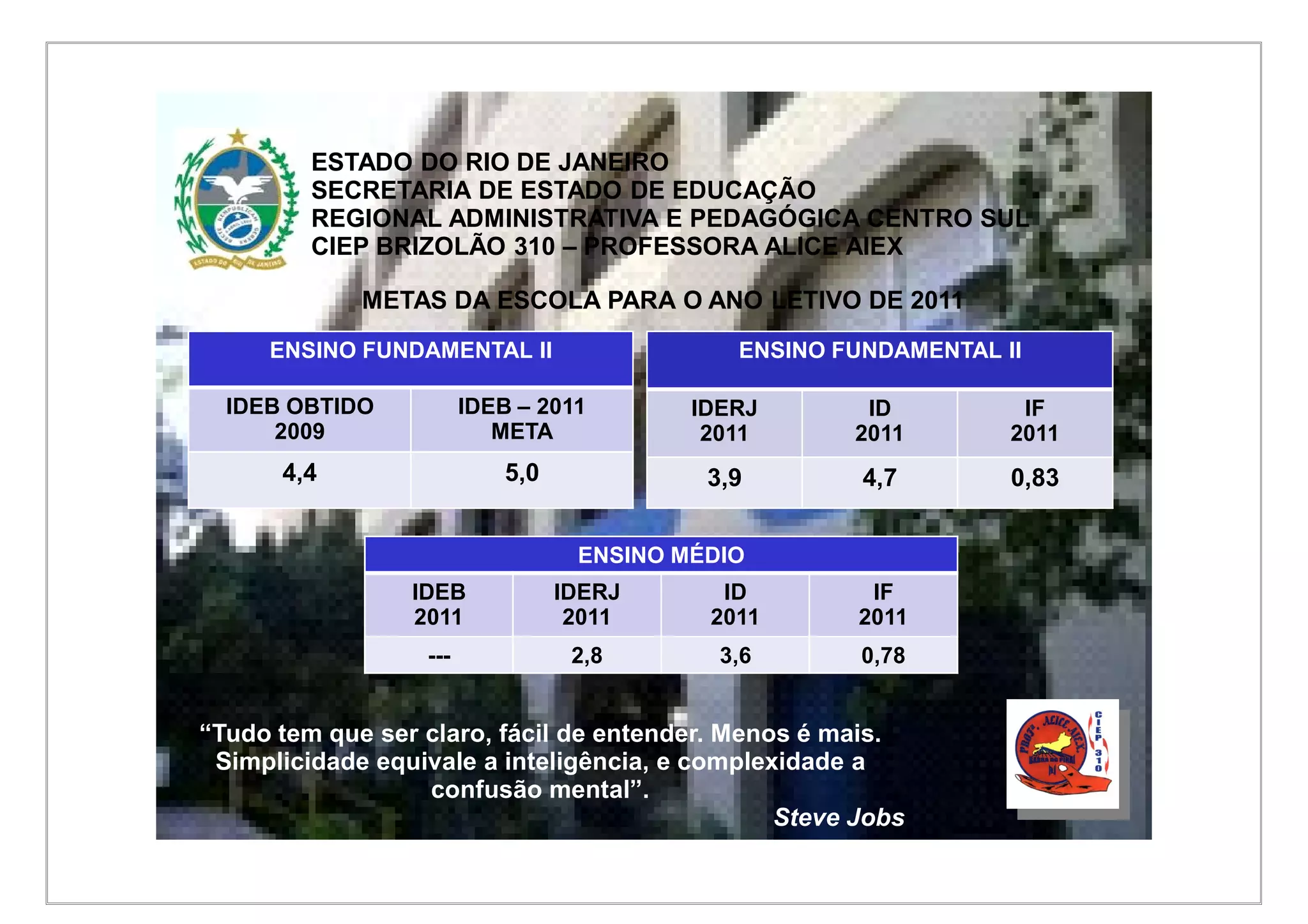 O documento apresenta as metas da escola CIEP Brizolão 310 para o ano letivo de 2011, incluindo melhorar os índices IDEB, IDERJ, ID e IF. Também define siglas como IDEB, IDERJ, ID e IF. Resume programas educacionais como SAERJINHO, 5S e ferramentas de avaliação como SAERJ, Prova Brasil e ENEM.