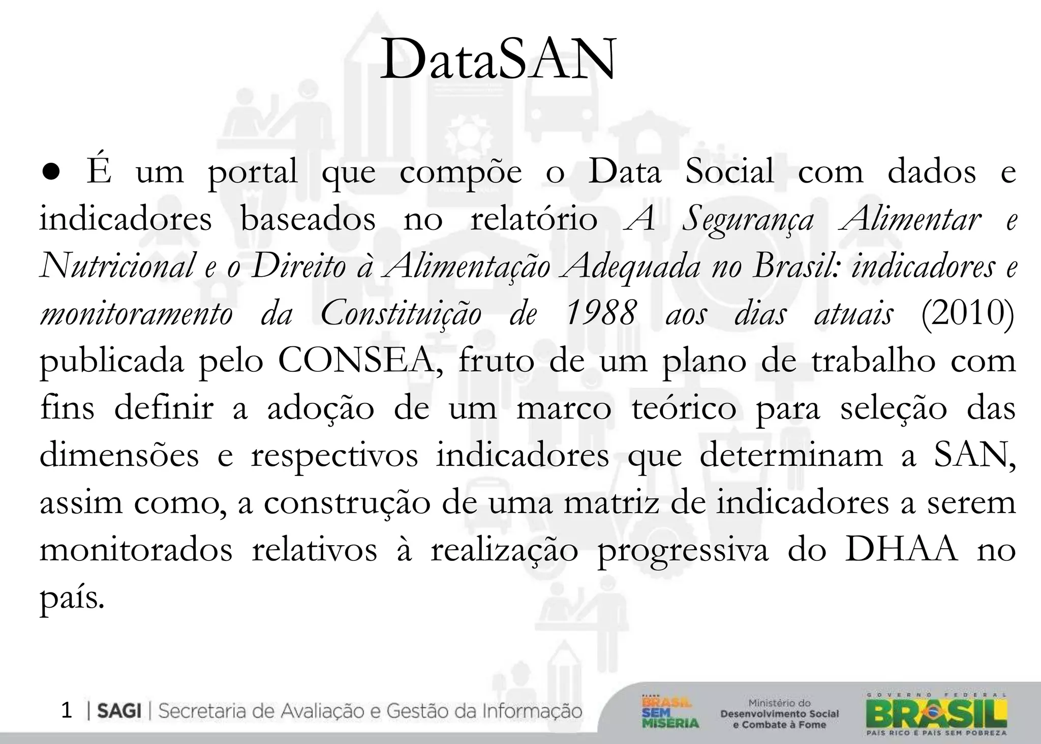 O documento descreve o DataSAN, um portal que fornece dados e indicadores sobre segurança alimentar e nutricional no Brasil. Ele contém indicadores divididos em abas cobrindo produção de alimentos, renda, acesso à alimentação, saúde e educação. O processo de carga de dados no sistema começou em 2011 e continua sendo atualizado com 44 indicadores de fontes como IBGE, DATASUS e INEP.