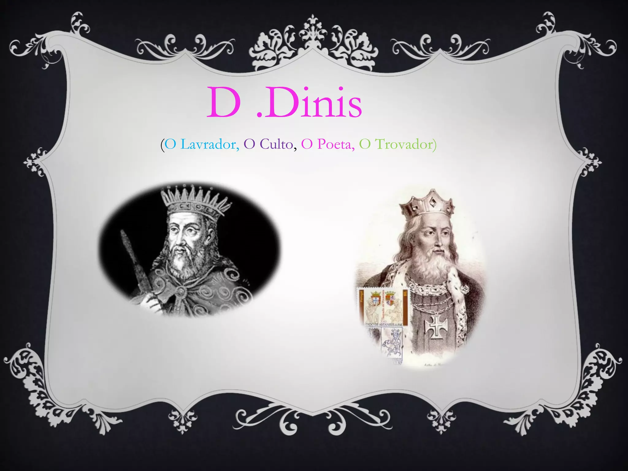 D. Dinis foi um rei de Portugal no século XIII que governou por 46 anos promovendo a paz e a identidade nacional. Ele expandiu as fronteiras, instituiu o português como língua oficial e fundou a primeira universidade portuguesa. Além disso, D. Dinis era um poeta e trovador que compôs cantigas de amigo e de amor.