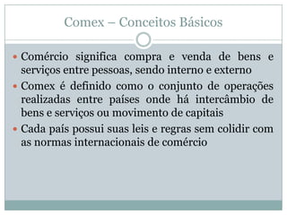 O documento discute conceitos básicos de comércio exterior, como a importância das importações e exportações para o desenvolvimento econômico de um país. Também apresenta dados sobre o comércio exterior brasileiro, órgãos governamentais envolvidos, documentos e processos de importação e exportação.