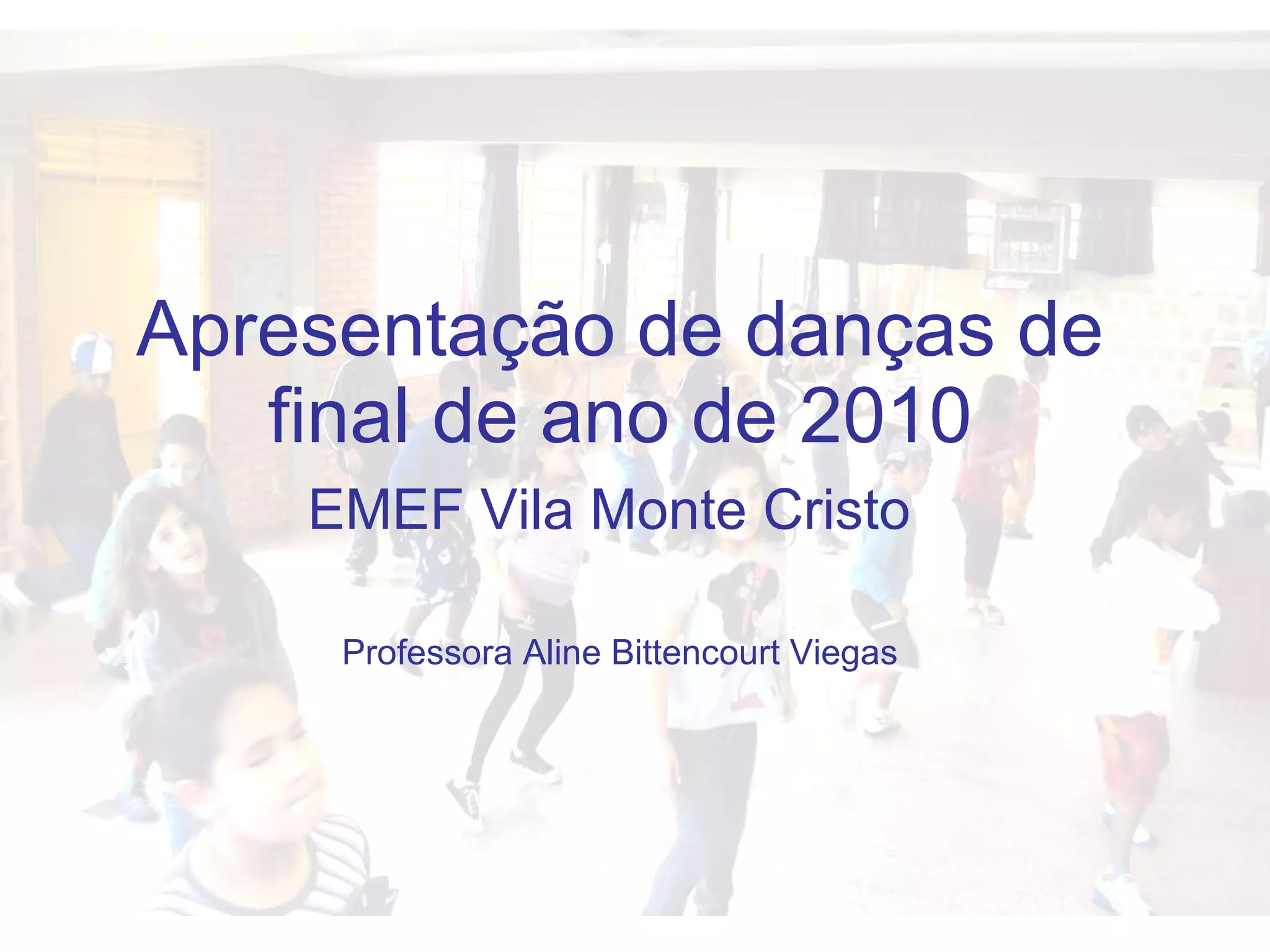 A apresentação de danças de final de ano da EMEF Vila Monte Cristo em 2010 envolveu 8 turmas e diferentes estilos de dança, como ballet e hip-hop. Os alunos e suas famílias participaram ativamente na confecção dos figurinos e nos ensaios, resultando em uma apresentação bem-sucedida no dia 1° de dezembro. O evento foi marcado por nervosismo, mas culminou em sucesso com a participação da comunidade escolar.