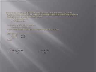 O documento descreve equações do segundo grau, definindo-as como ax2 + bx + c = 0 com a diferente de zero. Explica como resolver equações completas e incompletas, introduzindo a fórmula de Bháskara. A fórmula é usada para resolver três exemplos de equações. Propriedades como número de raízes reais são descritas. Relações entre coeficientes e raízes são provadas.