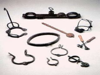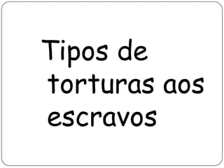 O documento descreve três tipos de tortura aplicadas aos escravos: o açoite, instrumento para castigar com chibatadas; os "anjinhos", que esmagavam os polegares dos escravos; e o "libambo", que prendia o pescoço do escravo fugitivo com um colar de ferro.