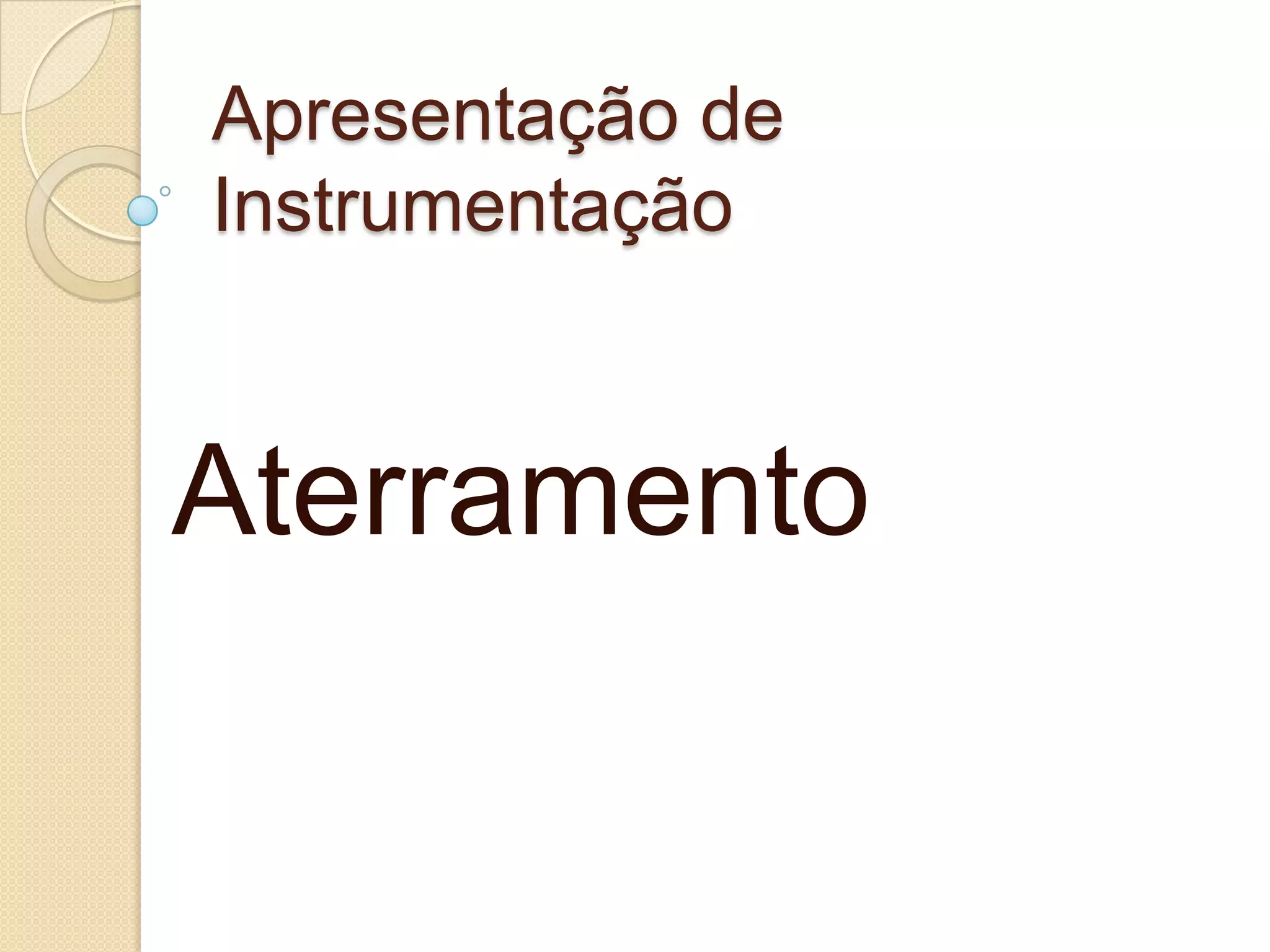 O documento discute os tipos de aterramento em sistemas elétricos, incluindo os sistemas TN-S, TN-C e TT. Também apresenta instrumentos de medição como o alicate terrometro usado para testar e medir a qualidade do aterramento.