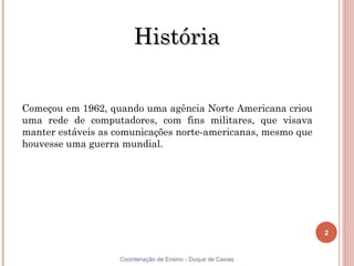 O documento descreve a história da internet, desde sua criação como uma rede de computadores militares dos EUA até se tornar uma rede global comercial. Ele explica que a internet começou a ser disponibilizada para universidades na década de 1960 e recebeu o nome "internet" nessa época. Também credita Paul Baran como um dos criadores da internet por ter proposto uma rede descentralizada em 1964.