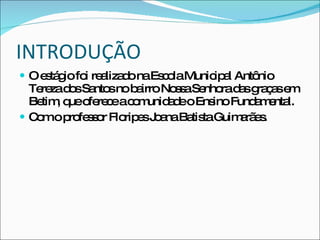 O relatório descreve um estágio de ensino supervisionado realizado em uma escola municipal em Betim, Minas Gerais. O estágio teve como objetivo observar aulas de matemática no ensino fundamental e desenvolver projetos para analisar a prática educacional. A intervenção do estagiário focou no ensino da multiplicação de números naturais, utilizando estratégias como malha quadriculada e decomposição dos fatores. A avaliação mostrou que os alunos interessados tiveram bom desempenho, enquanto outros tiveram dificuldades,