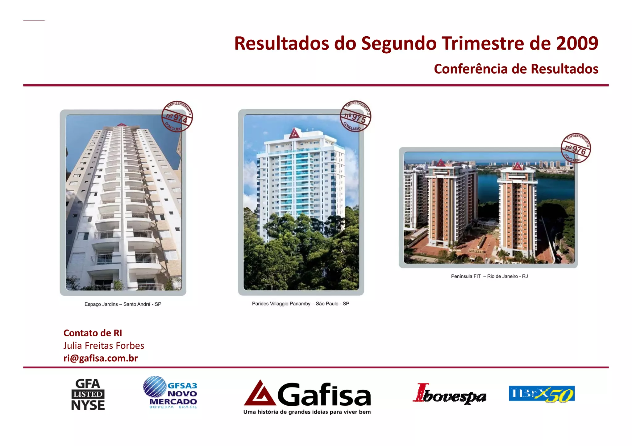 1) A Gafisa reportou resultados do 2o trimestre de 2009, com lançamentos 56% menores que no ano anterior em linha com sua estratégia conservadora.
