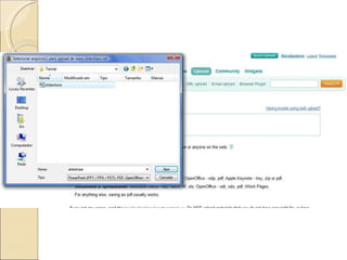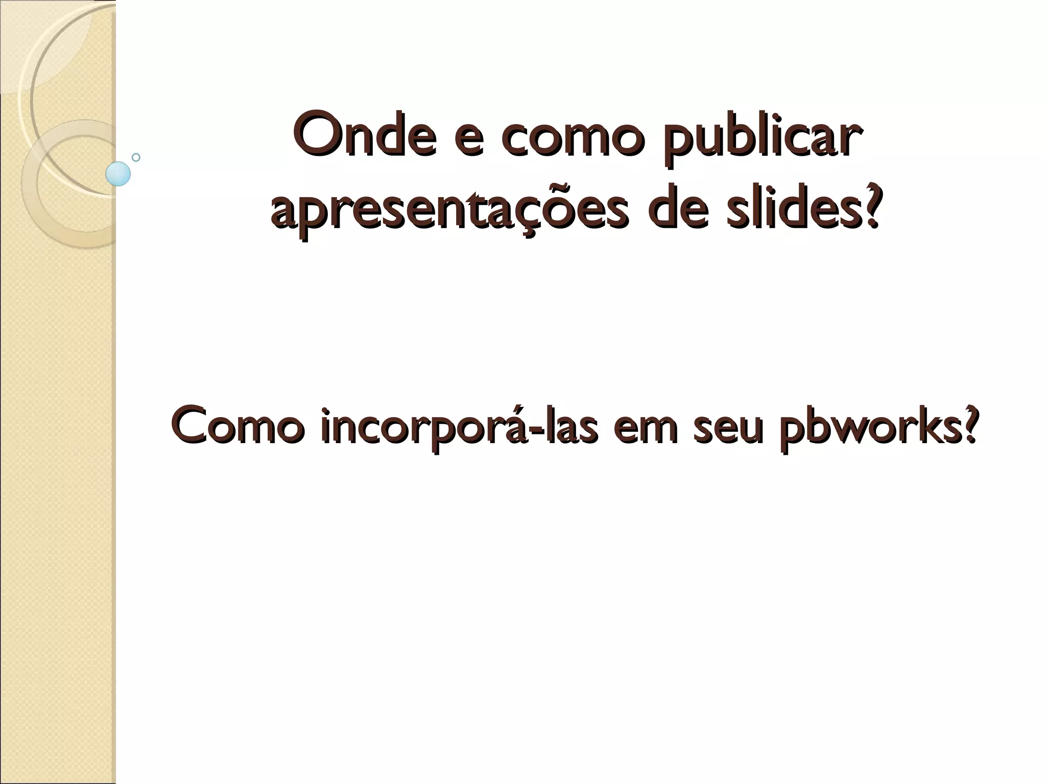 O documento explica como publicar apresentações no SlideShare e incorporá-las em outros sites como o PBWorks. O usuário deve criar uma conta no SlideShare, fazer o upload da apresentação e preencher informações sobre ela. Em seguida, copia o código HTML fornecido para incorporar a apresentação onde desejar, como em uma página no PBWorks.