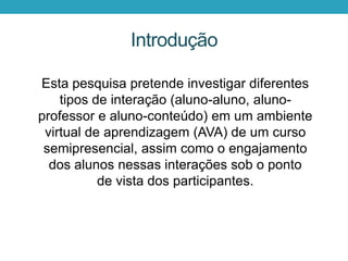 Esta dissertação investigou as interações (aluno-aluno, aluno-professor e aluno-conteúdo) e o engajamento dos alunos em um ambiente virtual de aprendizagem de um curso semipresencial. Os resultados mostraram que as interações foram consideradas suficientes, mas o volume excessivo de atividades online prejudicou o engajamento emocional dos alunos. A pesquisa recomenda equilibrar melhor as cargas online e presencial para promover o engajamento.