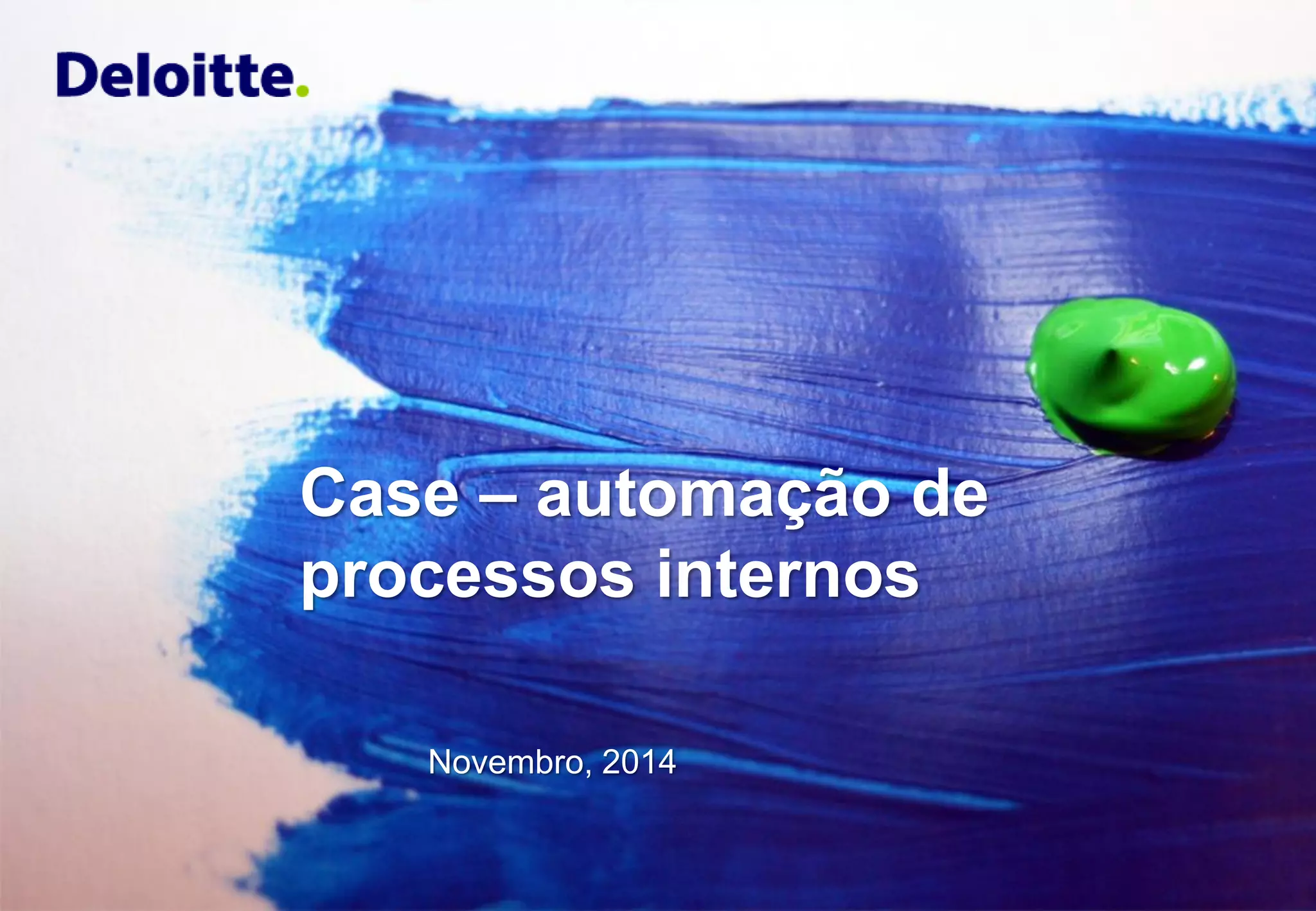 O documento discute a automação de processos internos da Deloitte usando a plataforma Bizagi. A Deloitte precisa reduzir tarefas manuais e aumentar a agilidade dos processos. A solução envolve automatizar formulários e fluxos de aprovação usando dispositivos móveis. A Bizagi foi escolhida por atender aos requisitos funcionais e técnicos da Deloitte e por ter um bom produto, viabilidade e suporte a preços acessíveis.