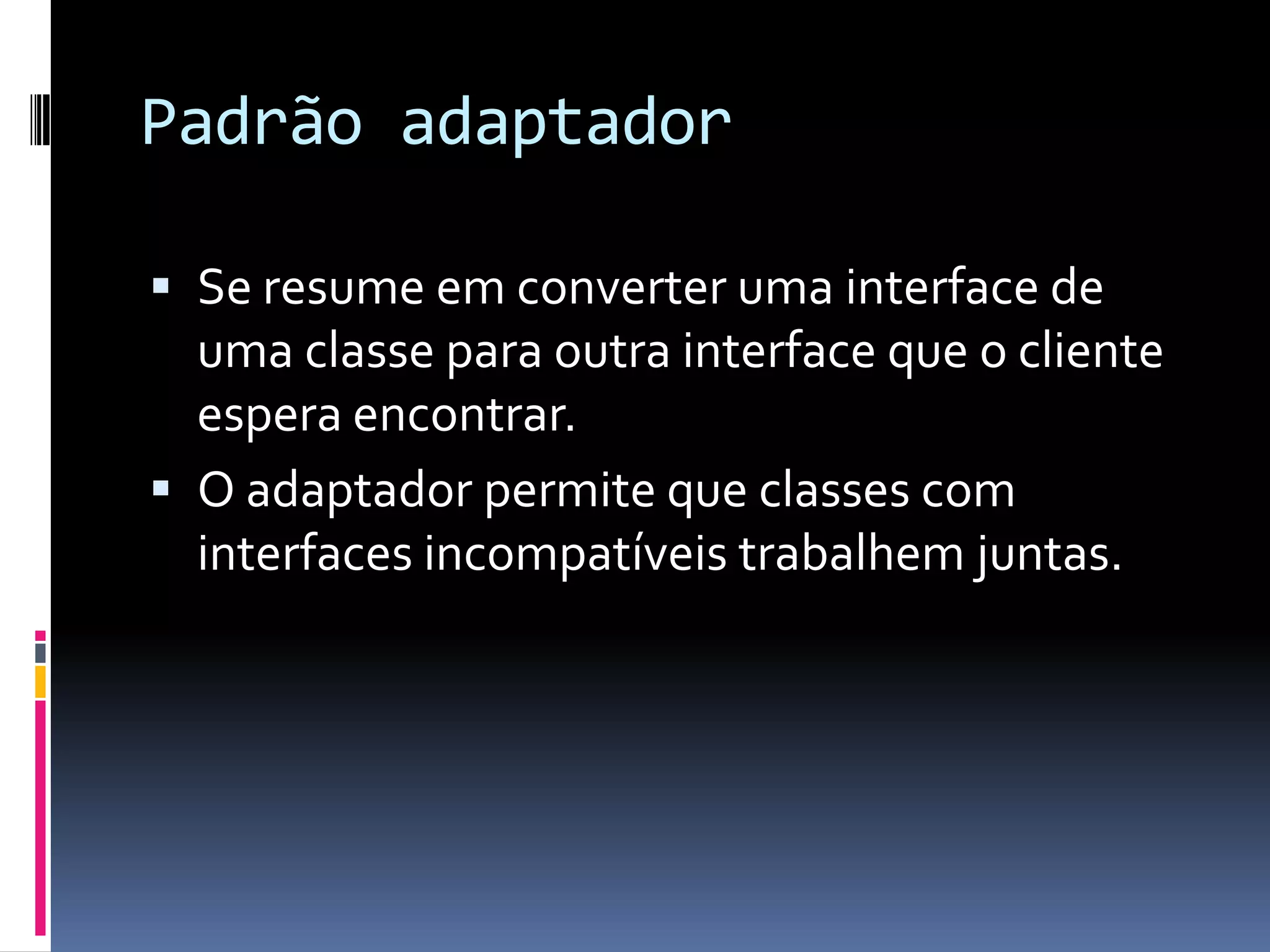 O documento descreve o padrão de projeto adaptador, que converte a interface de uma classe para outra interface compatível com o cliente. Ele permite que classes com interfaces incompatíveis trabalhem juntas. O documento fornece um exemplo de adaptador de objetos que converte uma classe Peru para a interface Pato, permitindo que um Peru se comporte como um Pato.