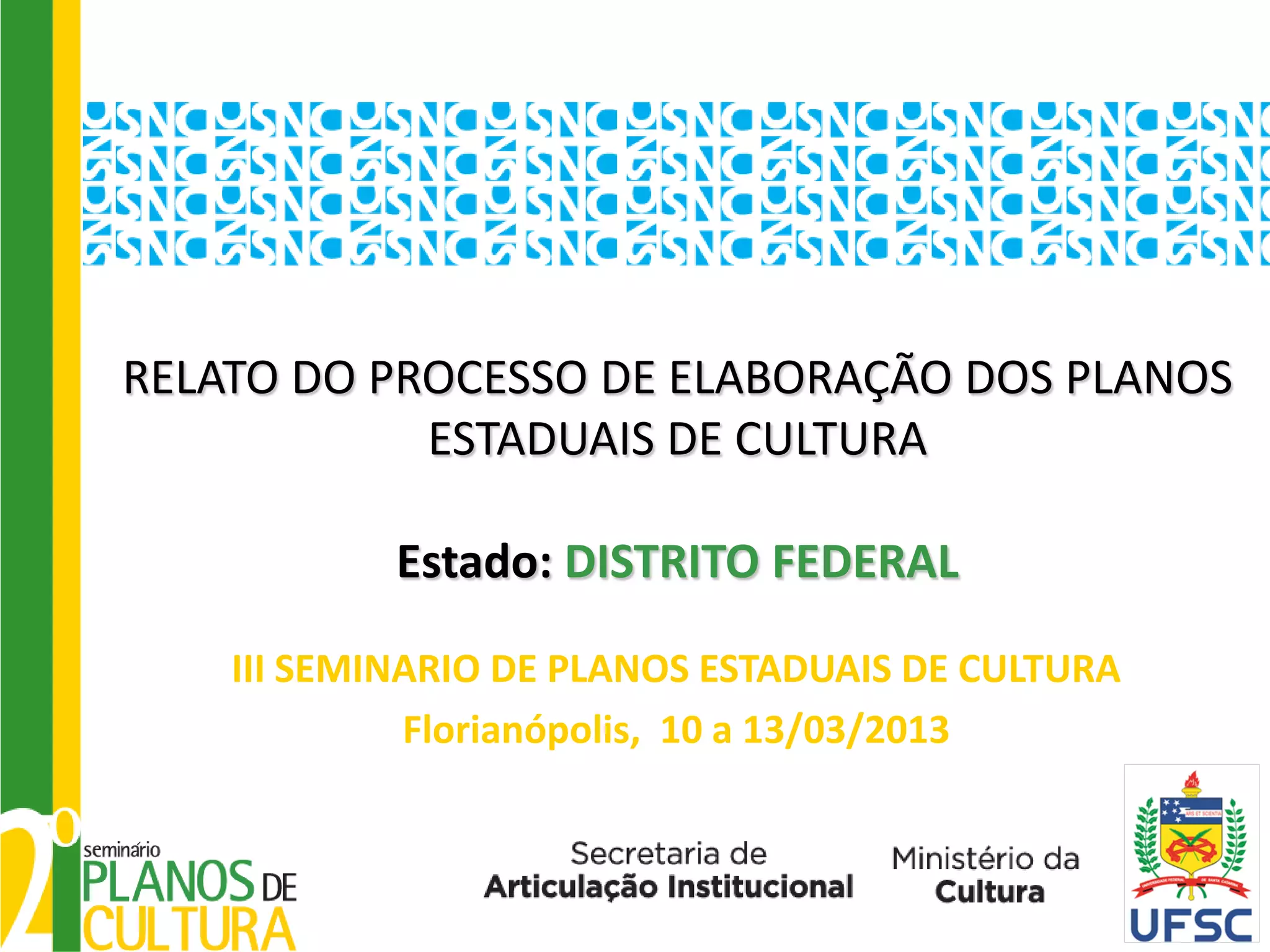 O documento descreve o processo de elaboração do Plano Estadual de Cultura do Distrito Federal. Uma equipe da Secretaria de Cultura trabalhou com facilitadores e representantes de diversos segmentos culturais para realizar etapas de sensibilização, diagnóstico e discussão do plano. O processo enfrentou desafios como falta de participação de outros órgãos, mas contou com a participação de centenas de pessoas.