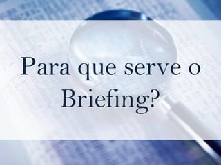 O documento discute o briefing de mídia e fornece dicas para sua elaboração. O briefing de mídia deve conter informações sobre o produto, público-alvo, posicionamento da marca, geografia, distribuição, sazonalidade, atividades promocionais e orçamento. Um bom briefing é conciso, crítico, evita excessos de formalidade e se concentra no objetivo do cliente.
