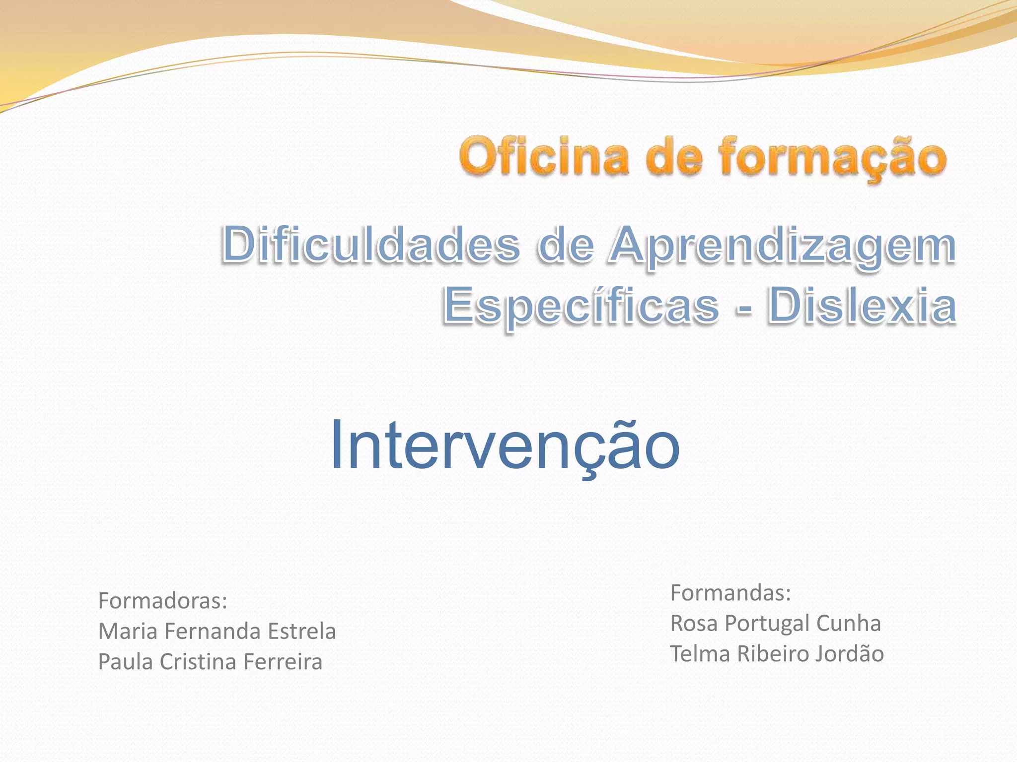 Este documento resume uma oficina de formação sobre dificuldades de aprendizagem específicas, como a dislexia. Apresenta o perfil de um aluno com dislexia e disortografia, e descreve intervenções escolares focadas no desenvolvimento de habilidades fonéticas, leitura, escrita e métodos de estudo. Inclui exemplos de materiais e jogos usados na intervenção, como o "Loto dos plurais" e o poema "Pedem paz".