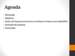 1. O documento descreve a abordagem GAS2SPL para engenharia de requisitos de linhas de produto de software, integrando modelos de objetivos, modelo de feature e cenários com separação de interesses transversais. 2. A abordagem adapta técnicas existentes como GS2SPL e MSVCM, definindo diretrizes para mapear objetivos em cenários aspectuais e representar variabilidade e configuração. 3. O processo GAS2SPL inclui atividades como elaboração de modelos de objetivos, identificação de features, especificação e config