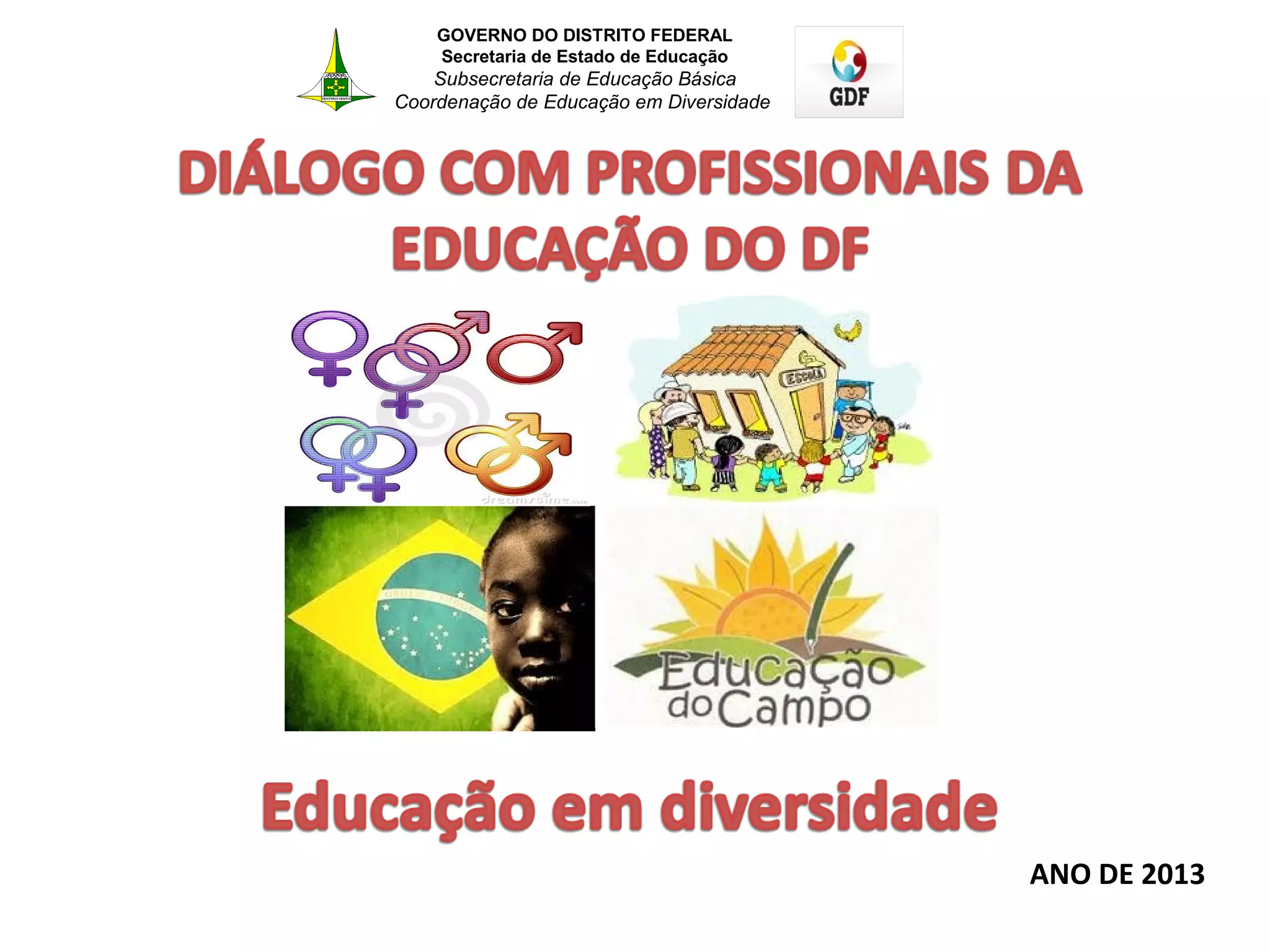 Este documento descreve as políticas de educação em diversidade do Distrito Federal, Brasil em 2013. Estabelece objetivos de inclusão de grupos historicamente excluídos nos processos educacionais e cria núcleos dedicados à diversidade de gênero, étnico-racial, educação do campo e programas especiais. Também define princípios como respeito à diversidade, participação comunitária e formação de professores sensíveis às necessidades locais.