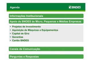 O documento fornece informações sobre financiamentos para MPMEs oferecidos pelo BNDES, incluindo projetos de investimento, máquinas e equipamentos, capital de giro, garantias e o Cartão BNDES. É detalhado os requisitos, taxas, prazos e canais de comunicação para acessar os diferentes programas de financiamento.