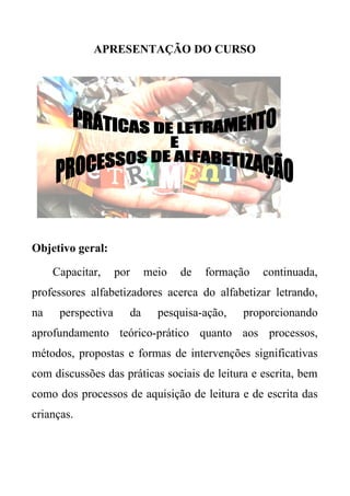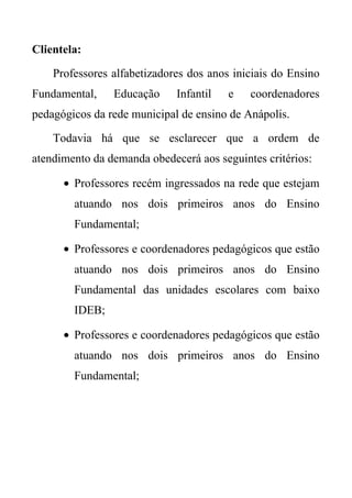 Este curso tem como objetivo capacitar professores alfabetizadores sobre os processos de alfabetização, métodos e intervenções significativas por meio da pesquisa-ação. O curso será oferecido a professores dos anos iniciais do ensino fundamental e educação infantil da rede municipal de Anápolis em 4 módulos de 60 horas cada um, abordando temas como linguagem, ensino da língua e diversidade cultural.