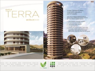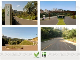 O documento descreve um empreendimento residencial sustentável localizado em Nova Lima, MG. O empreendimento oferece apartamentos de 244m2 com 4 quartos e áreas comuns como quadra de tênis, piscina, sauna e espaço gourmet. O projeto prioriza a sustentabilidade com sistemas de reuso de água, captação de chuva, aquecimento solar e posicionamento para ventilação natural.