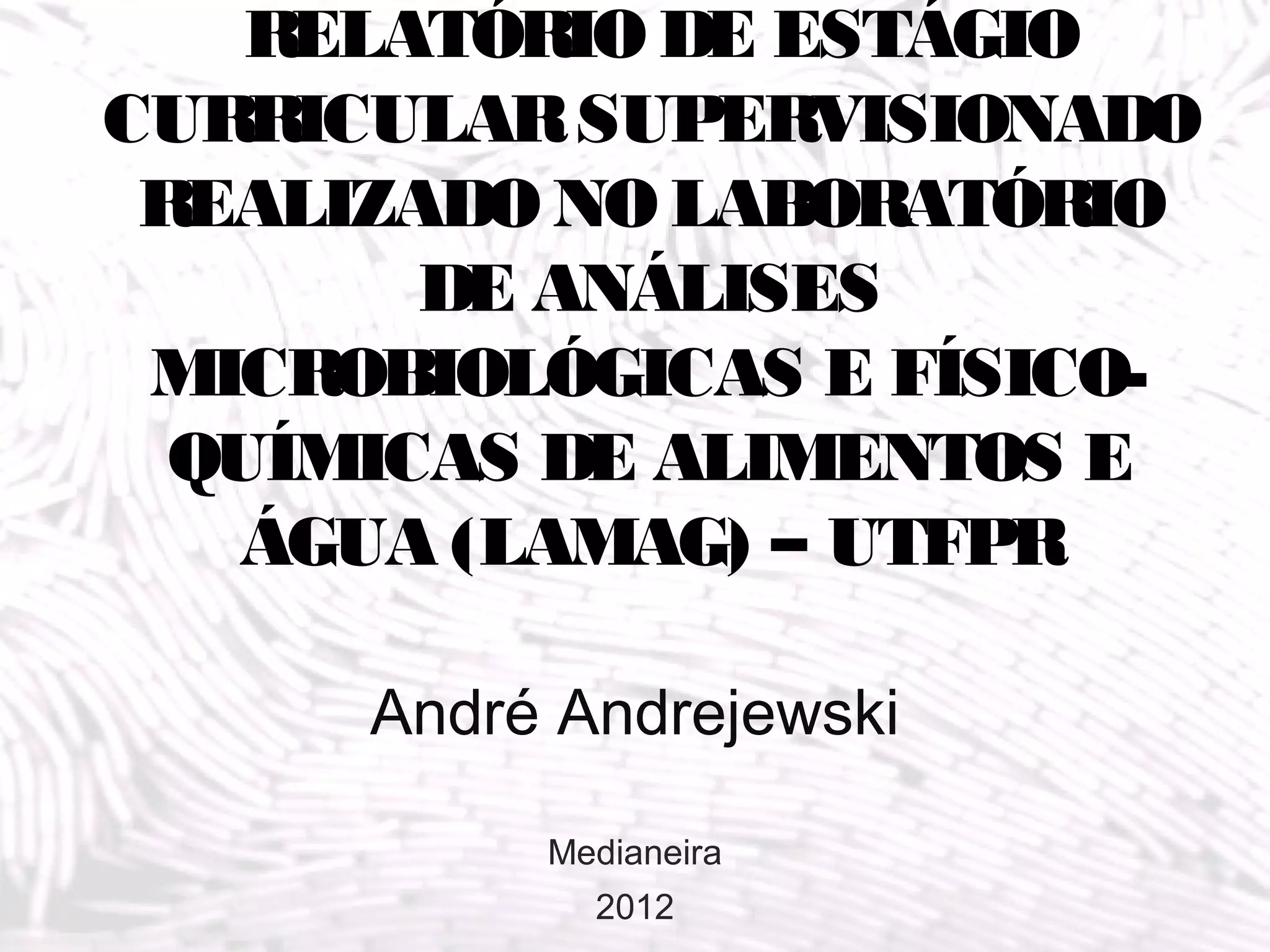 Este relatório de estágio descreve as atividades realizadas no Laboratório de Análises Microbiológicas e Físico-Químicas de Alimentos e Água (LAMAG) da UTFPR entre maio e novembro de 2011. O estágio teve como objetivos gerais desenvolver habilidades do estudante e ampliar seu conhecimento na área, e objetivos específicos como receber amostras, preparar meios de cultura, realizar análises microbiológicas e físico-químicas, e limpar equipamentos.
