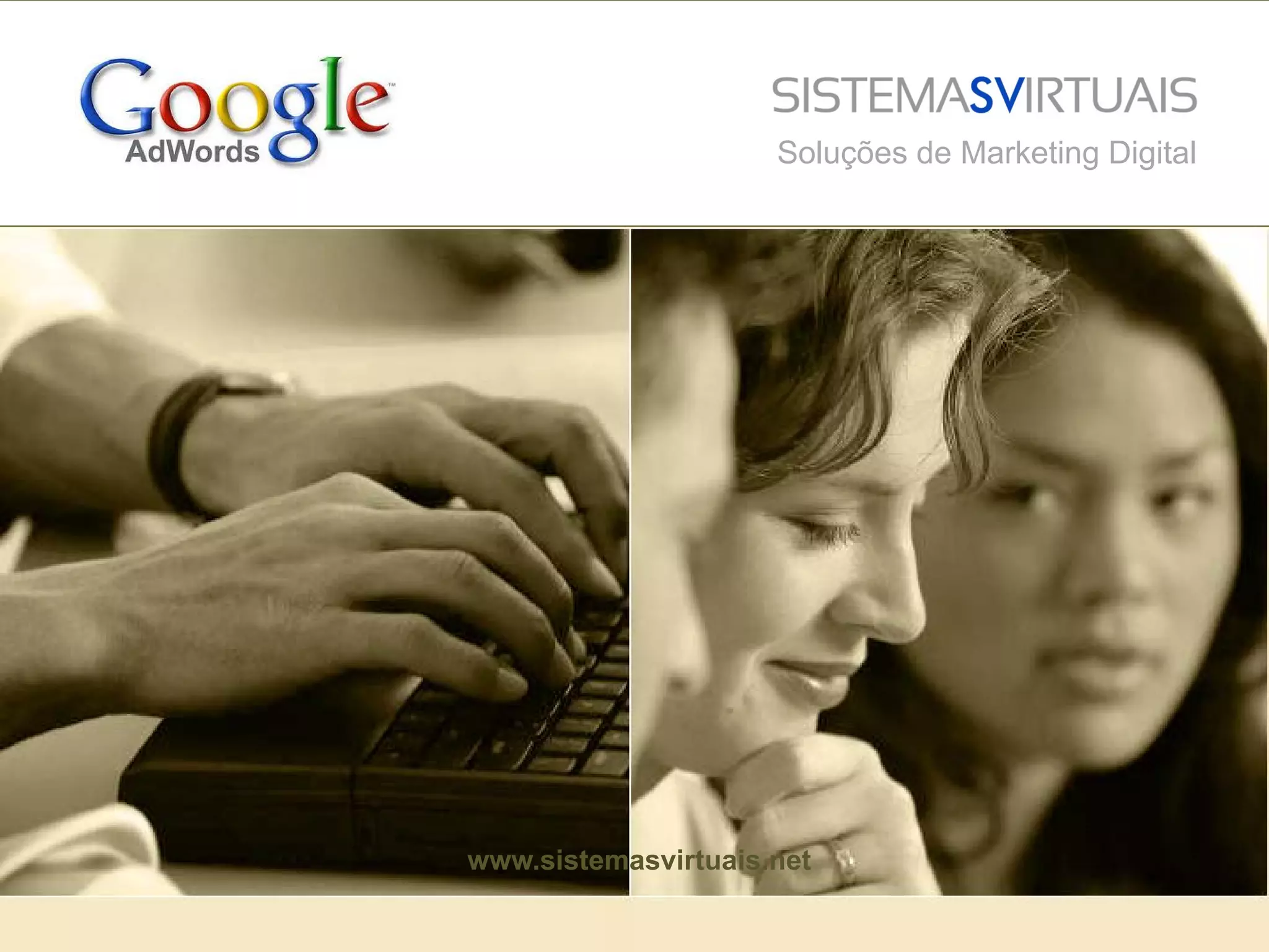 Este documento discute soluções de marketing digital da Sistemas Virtuais, incluindo o Google AdWords. Ele explica como o AdWords pode ser usado para gerar vendas e leads de forma segmentada e relevante, e como a Sistemas Virtuais pode ajudar clientes a otimizar suas campanhas do AdWords.