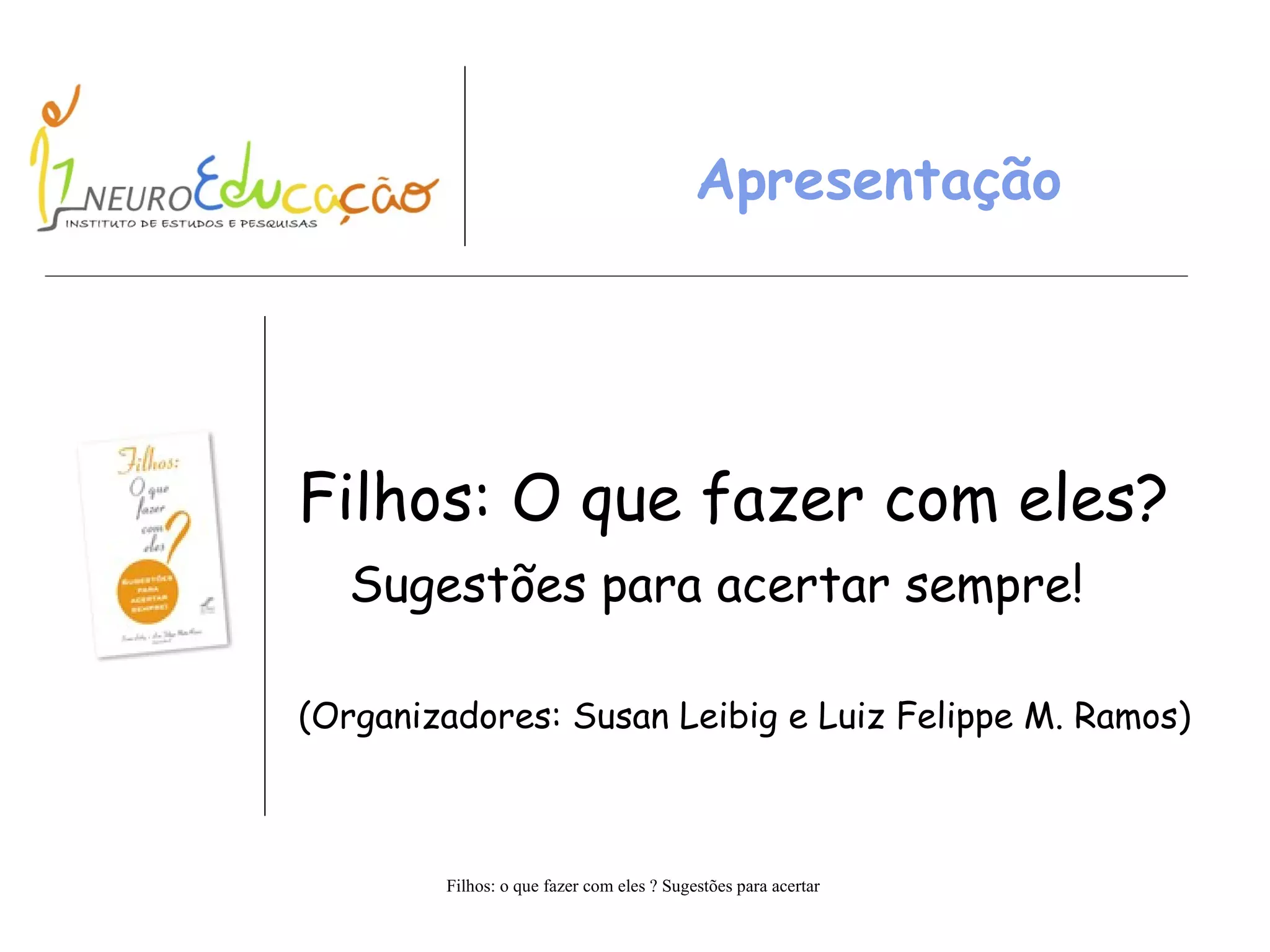 O documento discute aspectos importantes do desenvolvimento infantil e sugestões para a educação de filhos. Aborda o desenvolvimento físico, emocional e cognitivo das crianças, além de tratar sobre o papel dos pais, a liderança familiar, inteligência emocional, formação ética e moral e educar para libertar e motivar as crianças. Fornece recomendações para que os pais possam educar os filhos de forma tranquila, prazerosa e bem-sucedida.
