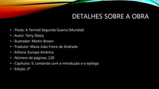 Este resumo descreve os principais eventos da Segunda Guerra Mundial entre 1938 e 1945, incluindo a ascensão de Hitler ao poder na Alemanha, a invasão da Polônia e outros países europeus, o bombardeio de Pearl Harbor que levou os EUA a entrar na guerra, e os eventos que levaram ao fim da guerra, como a libertação de Auschwitz e o suicídio de Hitler.