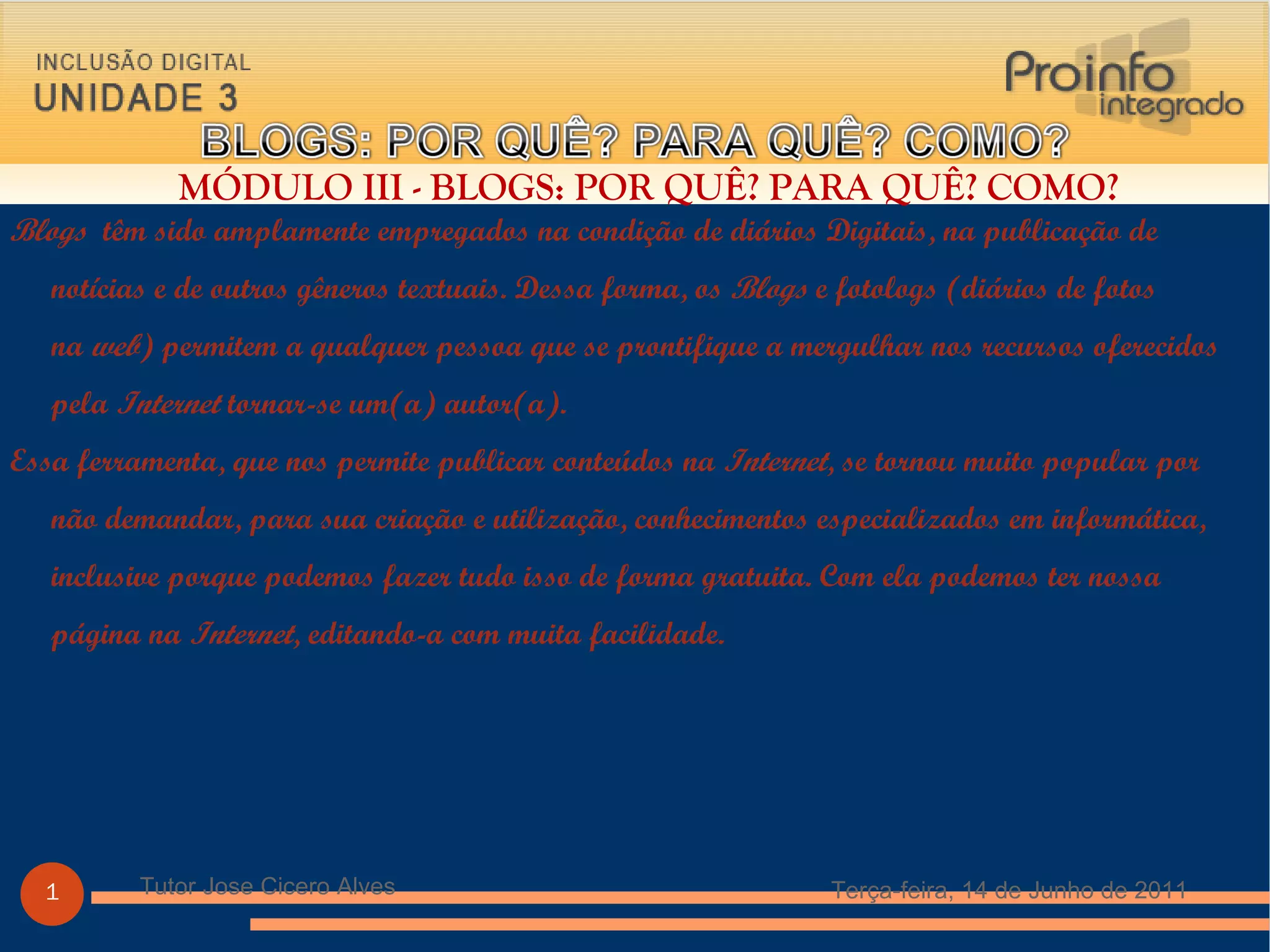 O documento discute o uso de blogs como ferramenta educativa, destacando que blogs permitem a qualquer pessoa publicar conteúdo na internet de forma gratuita e fácil. Também aborda como blogs podem ser usados para divulgar projetos de aprendizagem e incentivar a interatividade e troca de ideias entre autores e leitores.