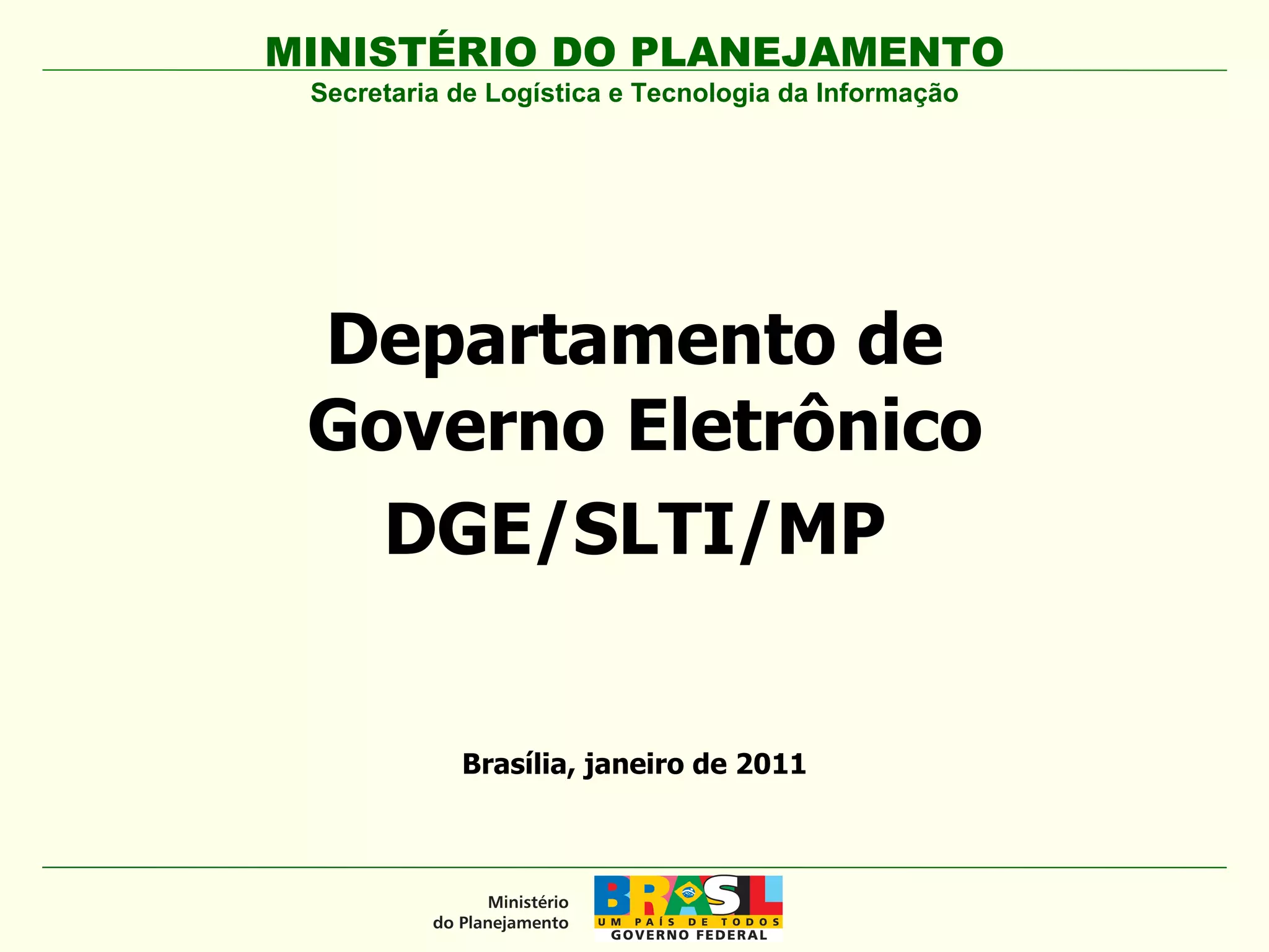 O documento apresenta uma proposta de plano de comunicação integrada para a Secretaria de Logística e Tecnologia da Informação (SLTI) do Ministério do Planejamento, com o objetivo de promover a cultura comunicacional, integrar departamentos e fazer ações de governo eletrônico mais visíveis ao público. Analisa o ambiente interno e externo, definindo públicos-alvo, estratégias de comunicação e a importância da colaboração interna entre os servidores. Também sugere a migração do portal do governo eletrônico para um sistema mais eficiente, além da utilização diversificada de mídias para melhorar a comunicação das iniciativas governamentais.