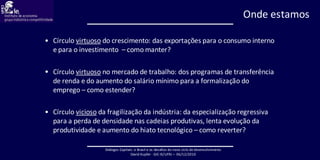 O documento discute os desafios do Brasil em um novo ciclo de desenvolvimento, abordando questões como o crescimento econômico, a formalização do emprego e a fragilização da indústria. Também analisa a importância da diversificação e especialização da indústria brasileira, as taxas de câmbio, e o papel da infraestrutura na competitividade. Por fim, destaca oportunidades relacionadas à sustentabilidade e à necessidade de capacitação institucional para melhorar a produtividade e a competitividade do país.