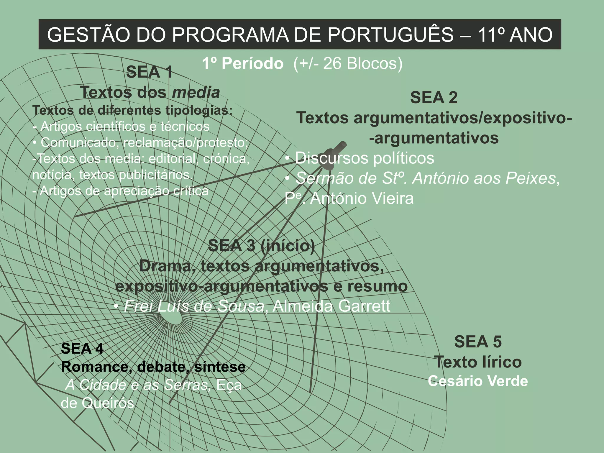 Este documento apresenta o programa de Português do 11o ano dividido em três períodos. No primeiro período, os alunos estudarão textos dos media e argumentativos de diferentes tipologias, incluindo um sermão de Pe. António Vieira. No segundo período, continuarão o estudo do drama "Frei Luís de Sousa" e do romance "Os Maias". No terceiro período, concluirão o estudo de textos líricos, incluindo poesia de Cesário Verde.