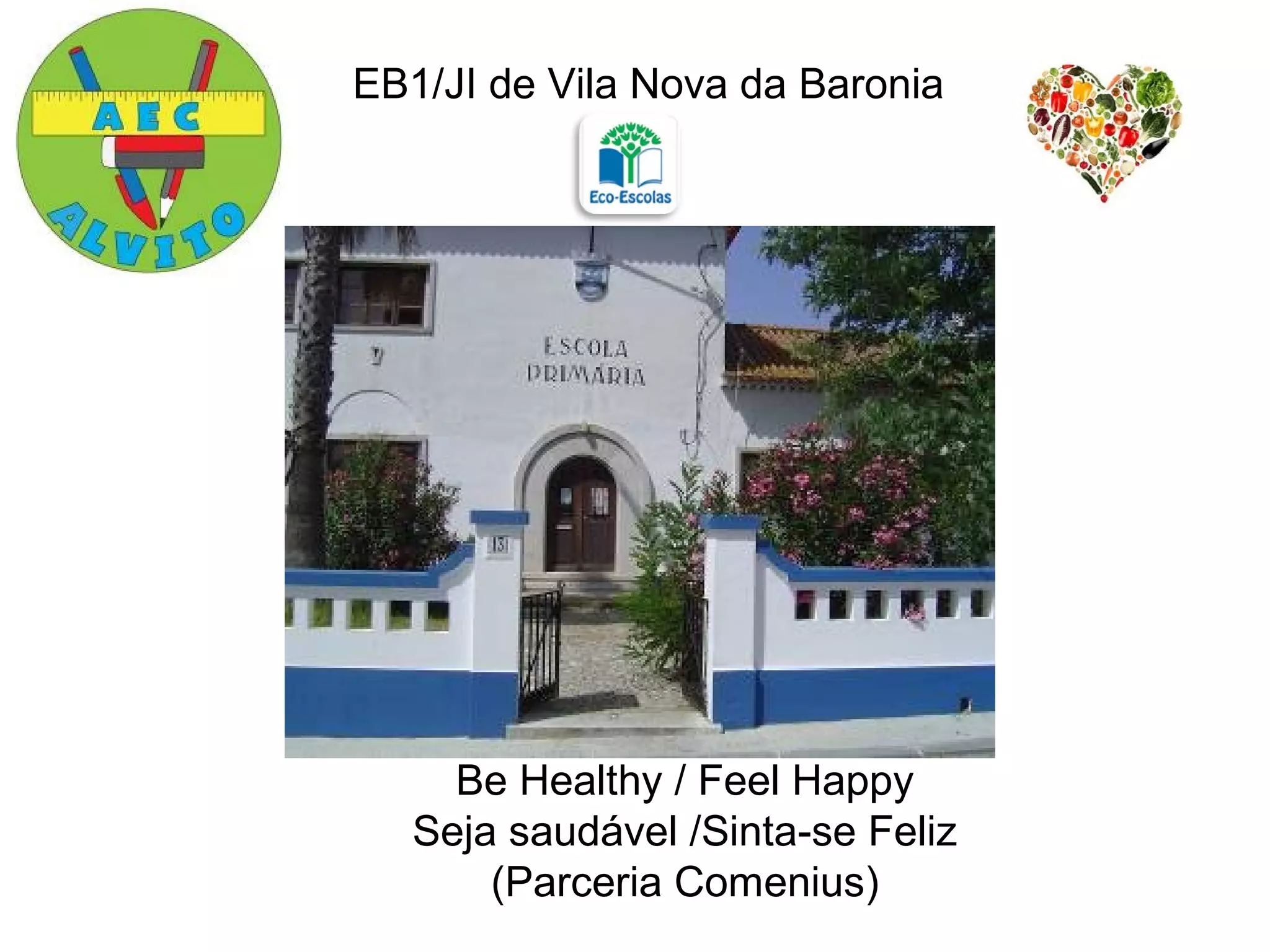 O documento descreve um projeto chamado "Be Healthy / Feel Happy" realizado pela EB1/JI de Vila Nova da Baronia em parceria com o Centro de Saúde e a Câmara Municipal de Alvito. O projeto visa promover hábitos de vida saudáveis como alimentação, exercício e sono entre estudantes, professores e famílias para melhorar o bem-estar da comunidade escolar.