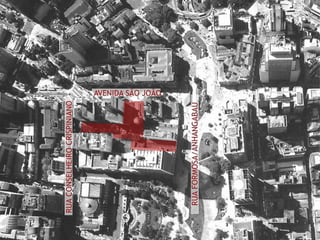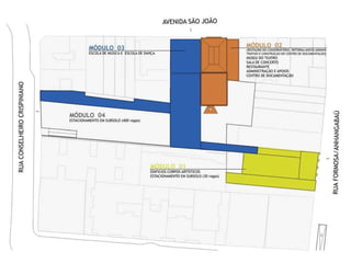 O documento apresenta um estudo preliminar e plano direcional para a Praça das Artes em São Paulo. Ele fornece detalhes sobre as áreas de quatro módulos propostos, incluindo edifícios para corpos artísticos, museu, sala de concerto, escolas de dança e música, além de estacionamentos subterrâneos. Também inclui plantas dos módulos e níveis do terreno.