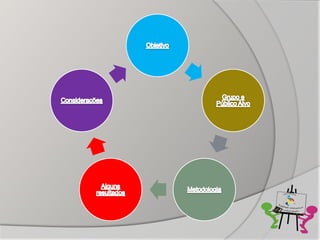 O documento descreve um projeto de extensão na Universidade Federal do Rio Grande que promove a interdisciplinaridade entre arte e matemática no ambiente educativo. O projeto envolve oficinas para estudantes e professores com o objetivo de aproximar as áreas de arte e matemática de forma lúdica e contextualizada.