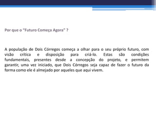 O projeto 'Dois Córregos 2030' visa engajar a população na construção de um futuro sustentável para a cidade, promovendo cooperação entre sociedade civil, poder público e iniciativa privada. A estratégia inclui planejamento, ação, e disseminação de informações, com foco na educação, cultura e economia criativa, para alcançar excelência até 2030. As propostas abordam desenvolvimento econômico, escolaridade e valorização cultural como pilares fundamentais para a transformação da cidade.