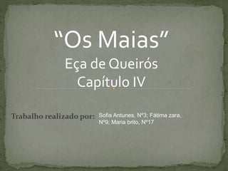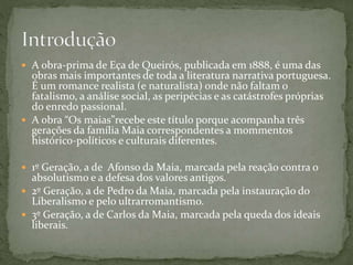 O documento resume o romance "Os Maias" de Eça de Queirós, descrevendo sua estrutura em três gerações da família Maia, os principais personagens como Carlos da Maia e João da Ega, o narrador onisciente, a crítica social à situação de Portugal no século XIX, e o período histórico em que se passa a história.