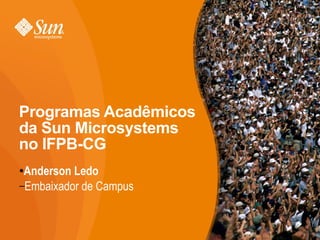O documento resume os principais programas acadêmicos da Sun Microsystems para estudantes e professores, incluindo a Iniciativa Acadêmica da Sun (SAI) que oferece treinamentos gratuitos online e descontos em certificações, e o grupo local da Universidade de Encontros de Código Aberto (OSUM) que promove tecnologias de código aberto.