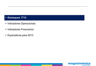 O documento resume os principais resultados operacionais e financeiros do Magazine Luiza no primeiro trimestre de 2013. Destaca o crescimento de 7% na receita bruta total em relação ao mesmo período de 2012, impulsionado por crescimento de 5,2% nas mesmas lojas. Apresenta também melhoria na margem bruta consolidada e redução de custos e despesas operacionais. Fornece detalhes sobre desempenho do segmento de financiamento Luizacred e expectativas positivas para os próximos trimestres.