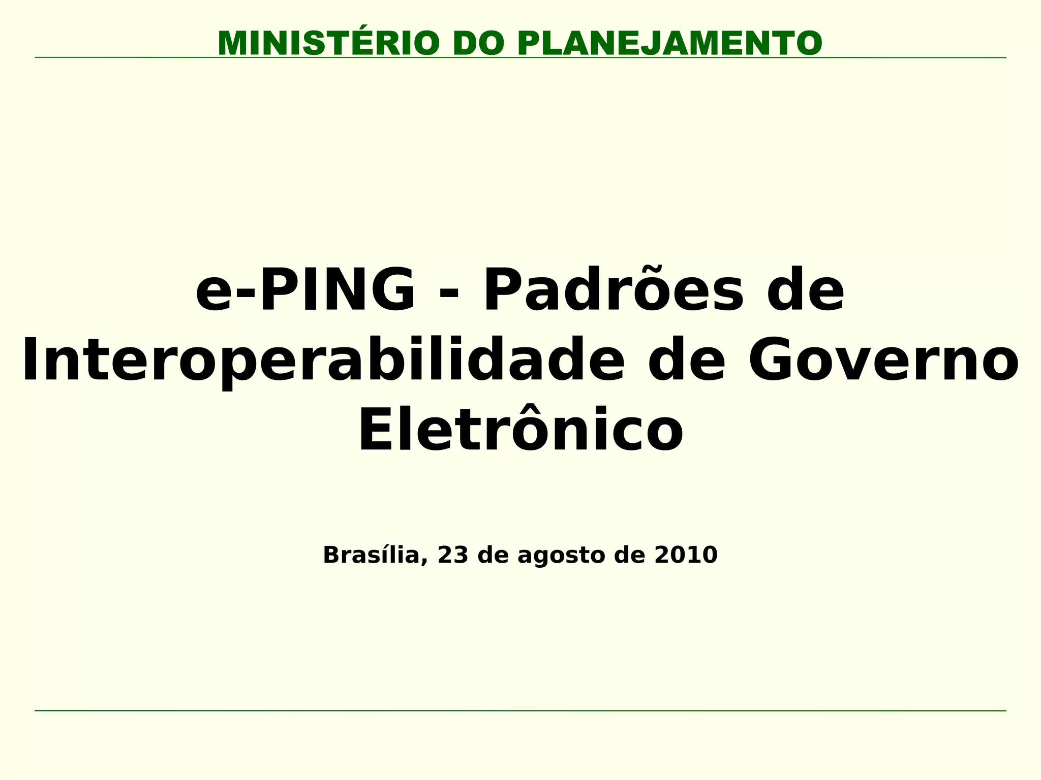 O documento discute a e-PING, a arquitetura de padrões de interoperabilidade do governo eletrônico brasileiro. A e-PING tem como objetivo integrar os sistemas governamentais e melhorar o acesso dos cidadãos aos serviços públicos digitais. O documento explica a definição, histórico, políticas, dimensões e componentes especificados da e-PING para estabelecer padrões técnicos e semânticos que promovam a interoperabilidade entre os órgãos governamentais.