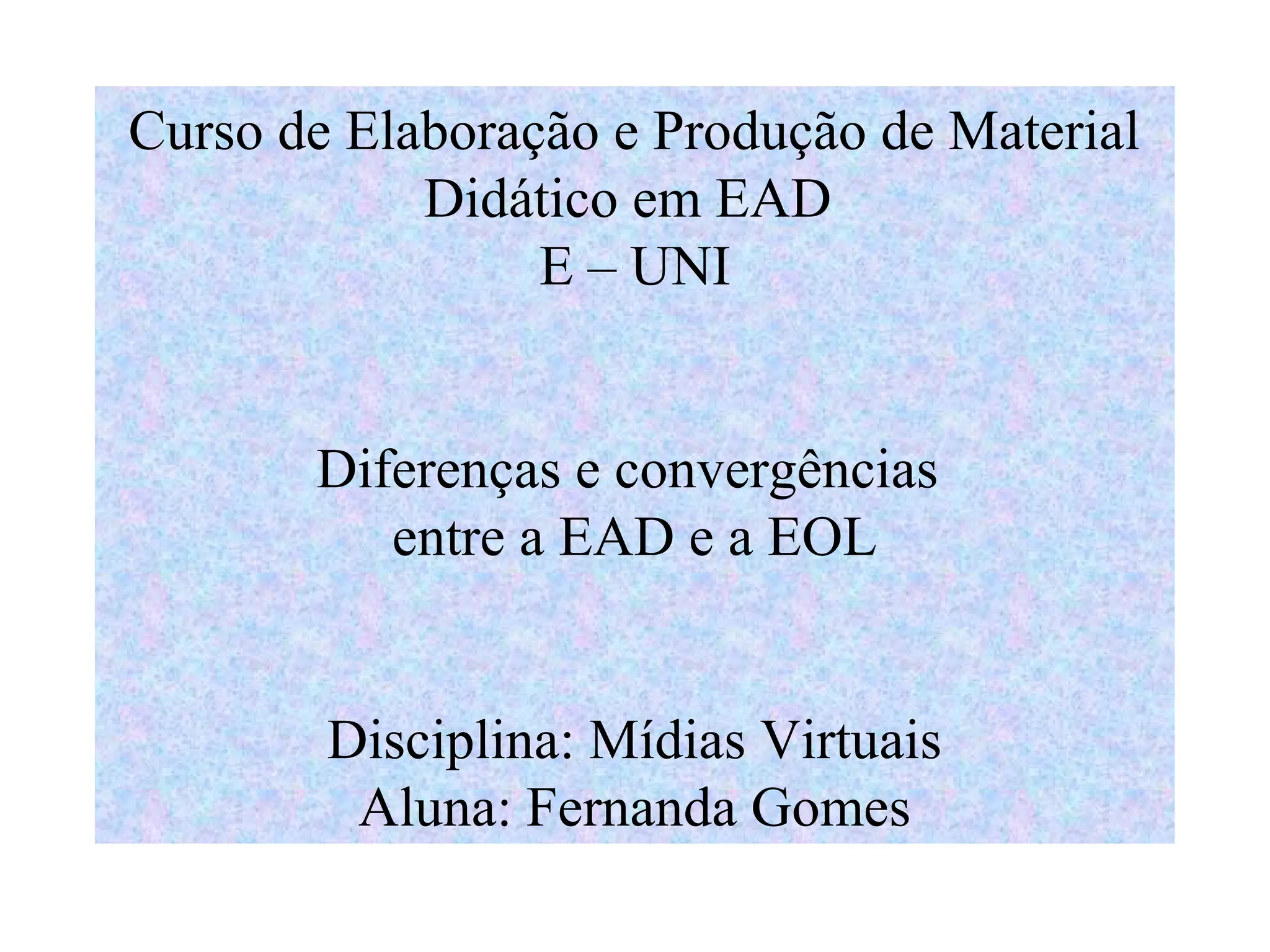 O documento compara e contrasta a educação a distância (EAD) e a educação online (EOL). A EAD pode usar rádio, TV e internet, enquanto a EOL ocorre apenas online. A EAD tem conteúdo predefinido e unilateral, em contraste com a EOL que é interativa e construída coletivamente. Ambas usam tutores, mas a EOL não separa ensino presencial e a distância graças à tecnologia que permite encontros e diálogos apesar da distância geográfica.