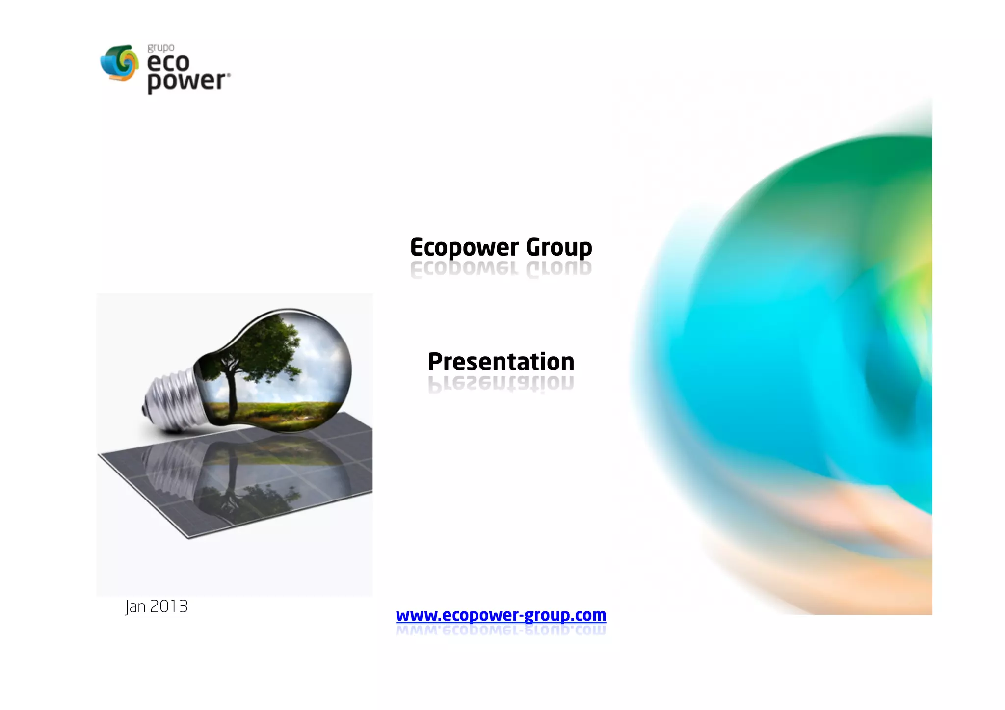 O documento apresenta o Grupo Ecopower, sua experiência de 14 anos no setor de energias renováveis. Detalha suas principais competências como objetividade, dinamismo, qualidade e economia. Apresenta metas alcançadas na Europa de 3,529 MWp em projetos fotovoltaicos, eólicos e híbridos. Descreve também seus recursos humanos, equipamentos e serviços oferecidos, como instalações chave-na-mão e manutenção.