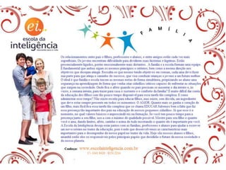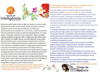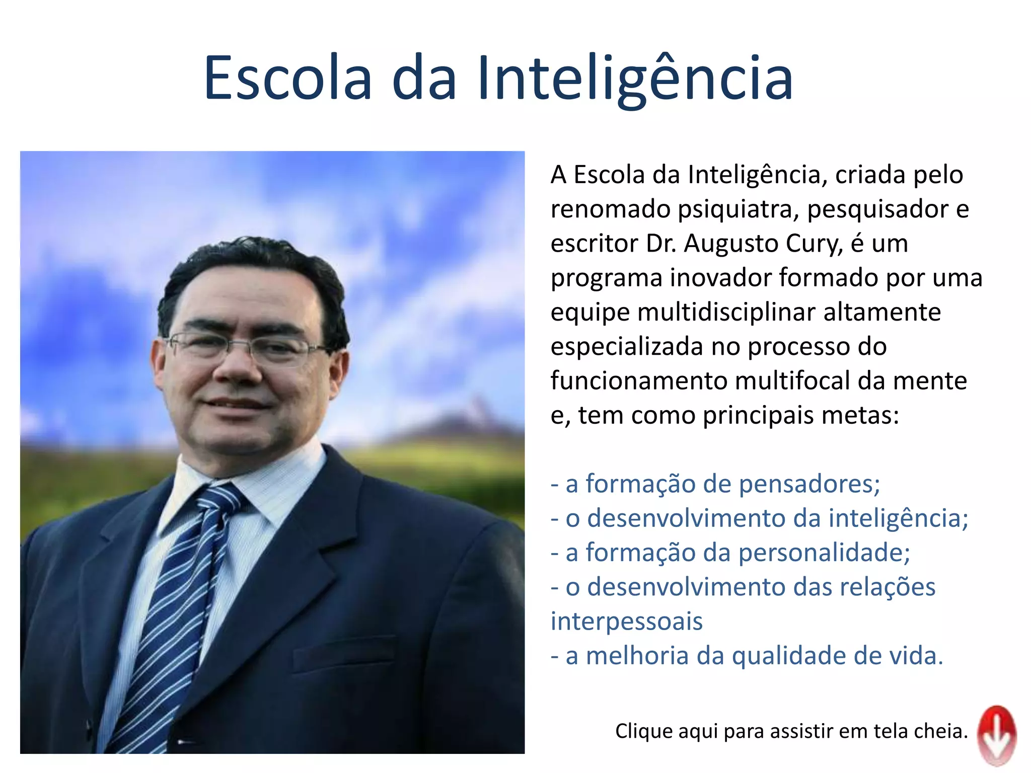 Escola da InteligênciaAEscola da Inteligência, criada pelo renomado psiquiatra, pesquisador e escritor Dr. Augusto Cury, é um programa inovador formado por uma equipe multidisciplinar altamente especializada no processo do funcionamento multifocal da mente e, tem como principais metas:- a formação de pensadores;- o desenvolvimento da inteligência;- a formação da personalidade;- o desenvolvimento das relações interpessoais- a melhoria da qualidade de vida.Clique aqui para assistir em tela cheia.