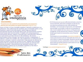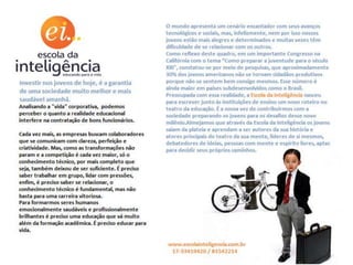A Escola da Inteligência foi criada pelo Dr. Augusto Cury para formar pensadores e desenvolver a inteligência, personalidade e relações interpessoais por meio de uma equipe multidisciplinar, melhorando a qualidade de vida.