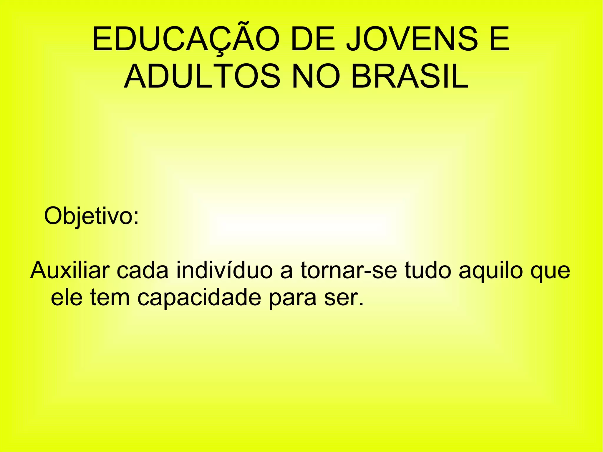 O documento discute a educação de jovens e adultos no Brasil, com foco na alfabetização e capacitação ao longo da vida para o desenvolvimento individual, profissional e social. Apresenta os principais programas de educação de jovens e adultos ao longo da história e conclui que a alfabetização atual visa a formação cidadã.
