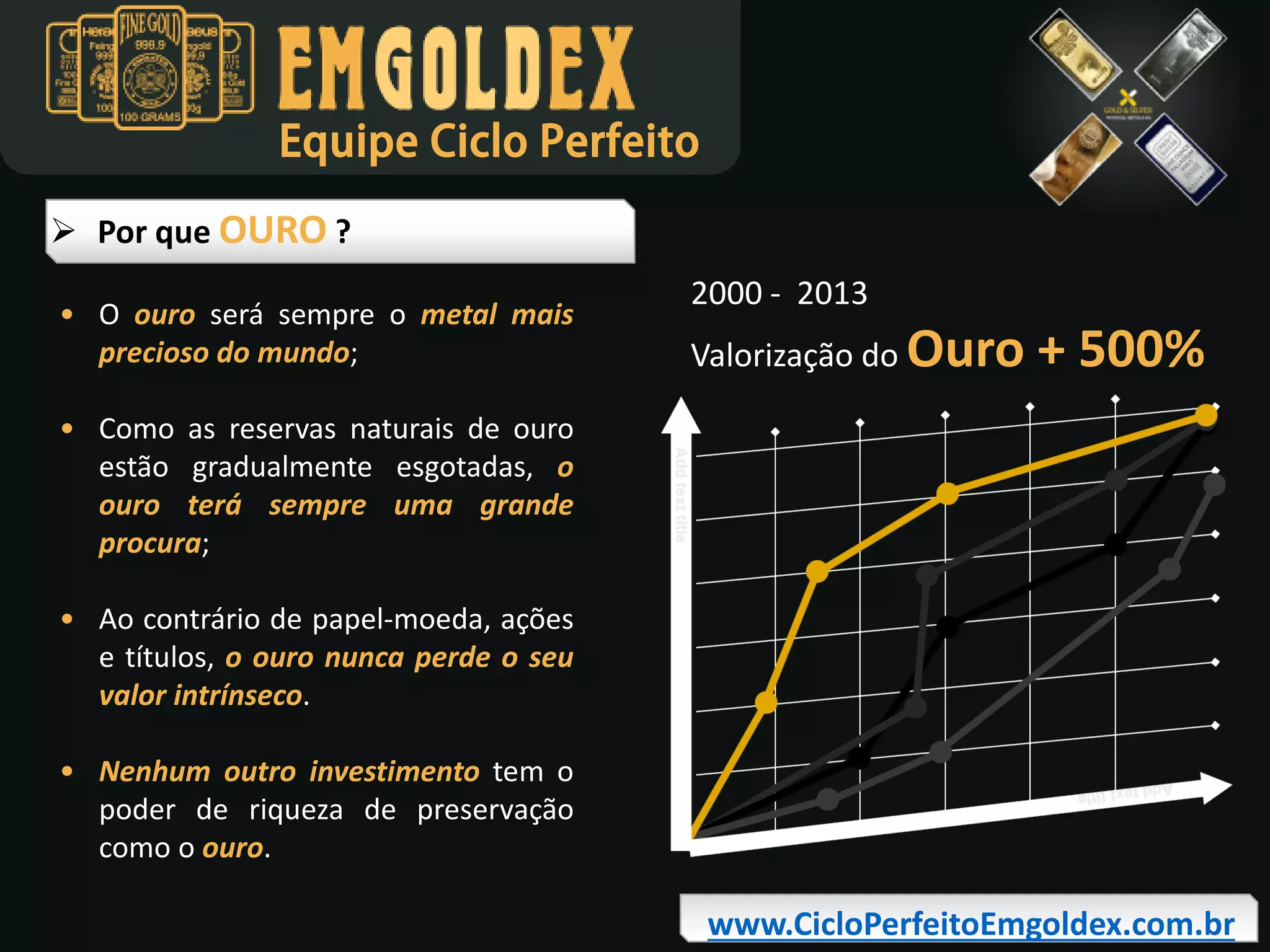 O documento descreve um programa de investimento em ouro oferecido pela empresa Emgoldex, que vende barras de ouro físico. O programa permite que os participantes ganhem retornos através de um sistema semelhante a um consórcio, no qual eles entram em uma "mesa de pedidos" com direito a dois ciclos para recrutar outros investidores e receber prêmios em ouro ou dinheiro. O documento explica os detalhes do produto, processo de participação, riscos envolvidos e como a empresa lucra com o